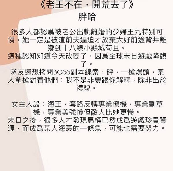 女強爽文,應該算無限流,但是越來越偏網遊文的感覺,有一點基建文。無cp。這本心得好難寫啊,很長,而且要素很多。背景是地區被一個遊戲覆蓋,小說裡是寫毀滅原本的文明,所有人也都成為玩家要透過一個個副本去提升自己的屬性,然後後來還可以建城有領地之類的。主線劇情就是女主要拯救一直以來照顧自己的老太太還有抵抗外來的侵略種族。女主超強,海王人設,很會撩人,不管男女,但是說實話很瑪麗蘇,為了證明女主的魅力,有點搞太多人,都各種明戀暗戀女主,雖然剛開始確實哈哈還是蠻帶感的,但是後面會有點膩,也會覺得有點太誇張。這本劇情設定蠻特別的,副本大多蠻有趣,是比較是偏打怪的,不是劇情向的。但是後面加了越來越多各種元素和設定,有一點讓人混亂,看到後面也有點不耐煩,尤其後面又多了什麼不同種族又不同時空啥的,真的是看的有點累。然後小說蠻多字數是著墨在各種道具上,還有各種道具的功能上。