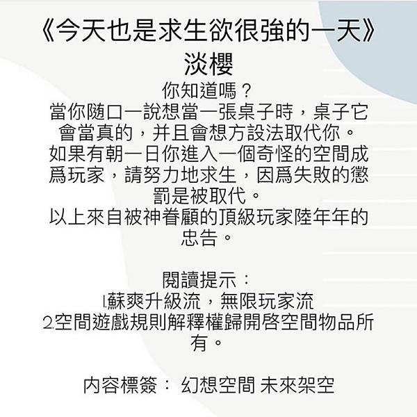 腦洞很特別,一旦有個物品被說想要成為,累積到一定量會被拉進空間裡求生,如果主神勝利就可以變成人。設定很特別,副本劇情也很有趣。