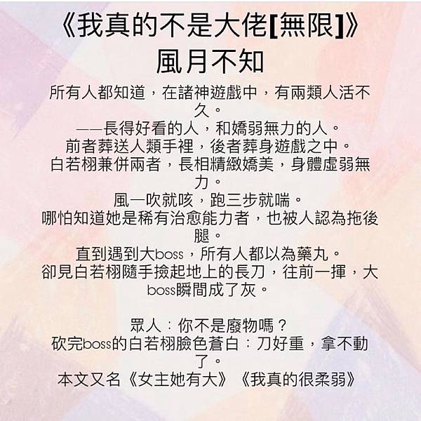 說實話,前面還蠻有趣的,但是看到中後就有點想棄了,雖然每個副本的劇情都不一樣,但是套路都有點像,就是女主對npc很好,慢慢感化它們,劇情也沒有很刺激的感覺,副本難易度我也覺得都沒有什麼變化,副本越後應該要越難,但是反而還覺得後面比較簡單,故事還更短,可能是因為女主金手指越來越大的關係。