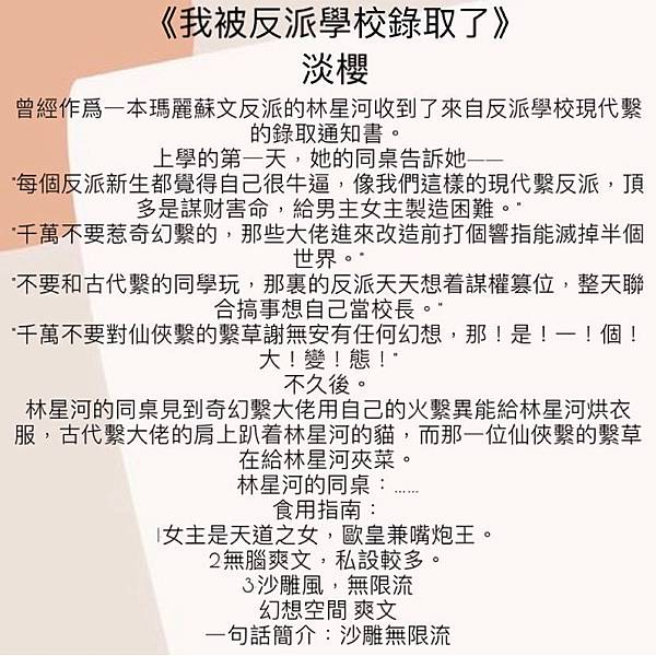 女主在被雷劈死後進到了一個反派學校,然後裡面的學生定期要參加副本去賺取積分,積分夠了就可以畢業然後重生。